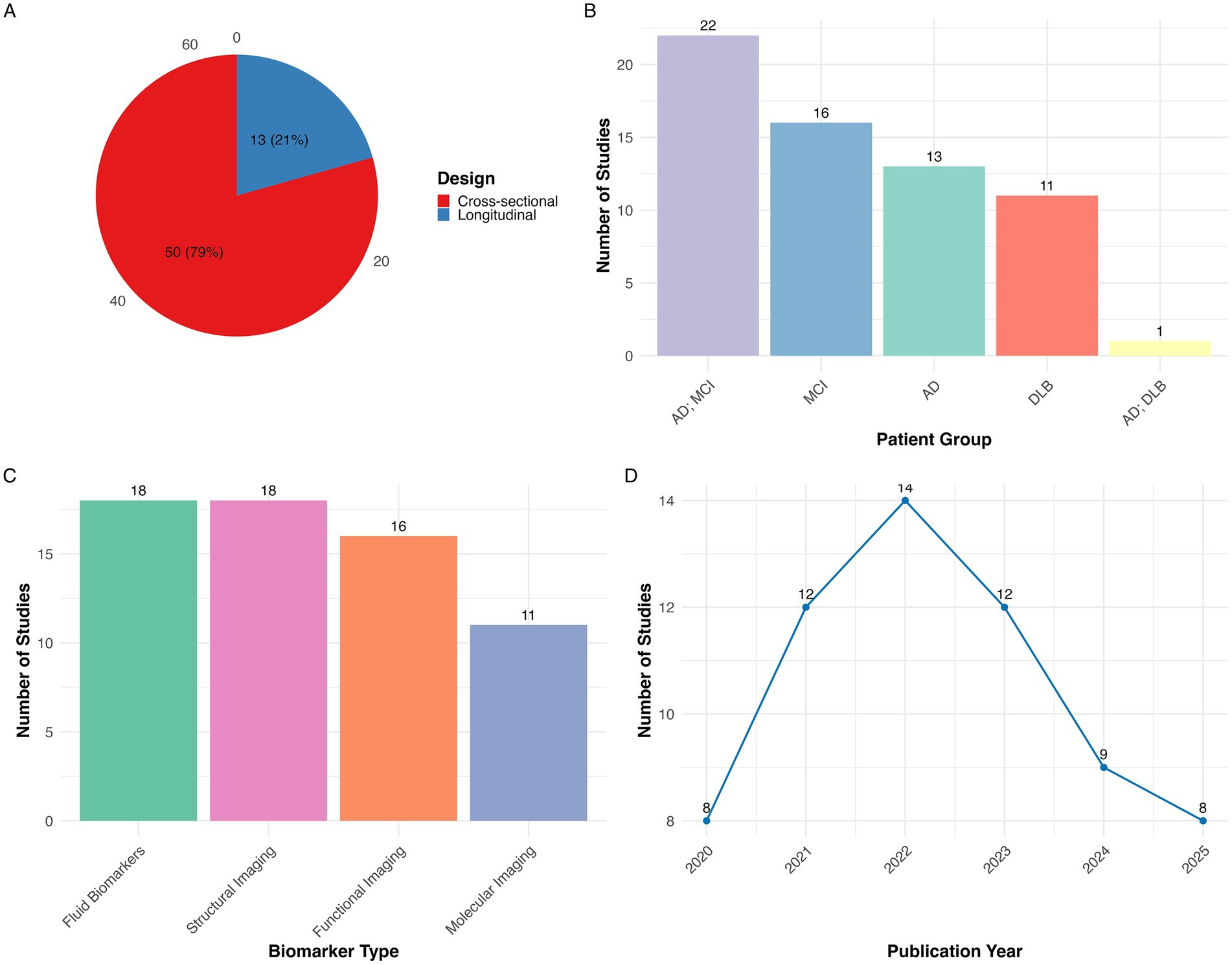 Figure 2. Summary of studies included in the systematic review of sex differences in dementia biomarkers (N = 63). (A) Distribution of studies by design showing that most studies were cross-sectional (n = 50, 78%) and the remainder were longitudinal (n = 13, 21%); (B) distribution of studies by patient group, indicating the number of studies conducted in AD+MCI, MCI, AD, DLB, AD+DLB; (C) distribution of studies by biomarker type, grouped into biofluid markers, structural imaging, functional imaging, and molecular imaging; (D) publication trend showing the annual number of studies from 2020 to 2025 with 2025 representing a partial year through May. AD, Alzheimer’s disease; MCI, Mild cognitive impairment; DLB, Dementia with Lewy bodies.