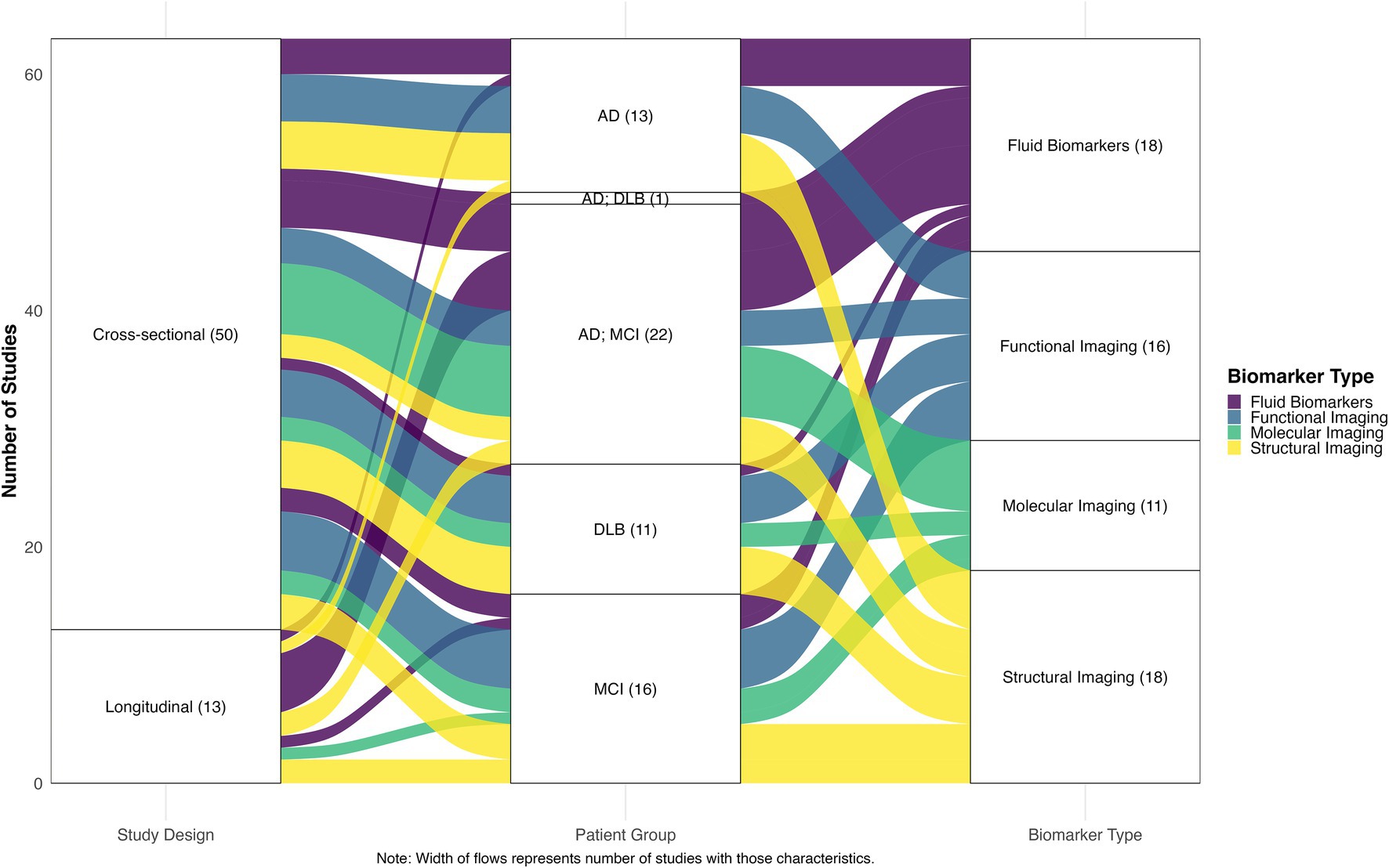 Figure 3. Alluvial plot of relationships between study designs, patient groups, and biomarker types. The width of the flows represents the number of studies with corresponding characteristics, illustrating the distribution and interconnections between methodological approaches across the included literature. AD, Alzheimer’s disease; MCI, mild cognitive impairment; DLB, Dementia with Lewy bodies.