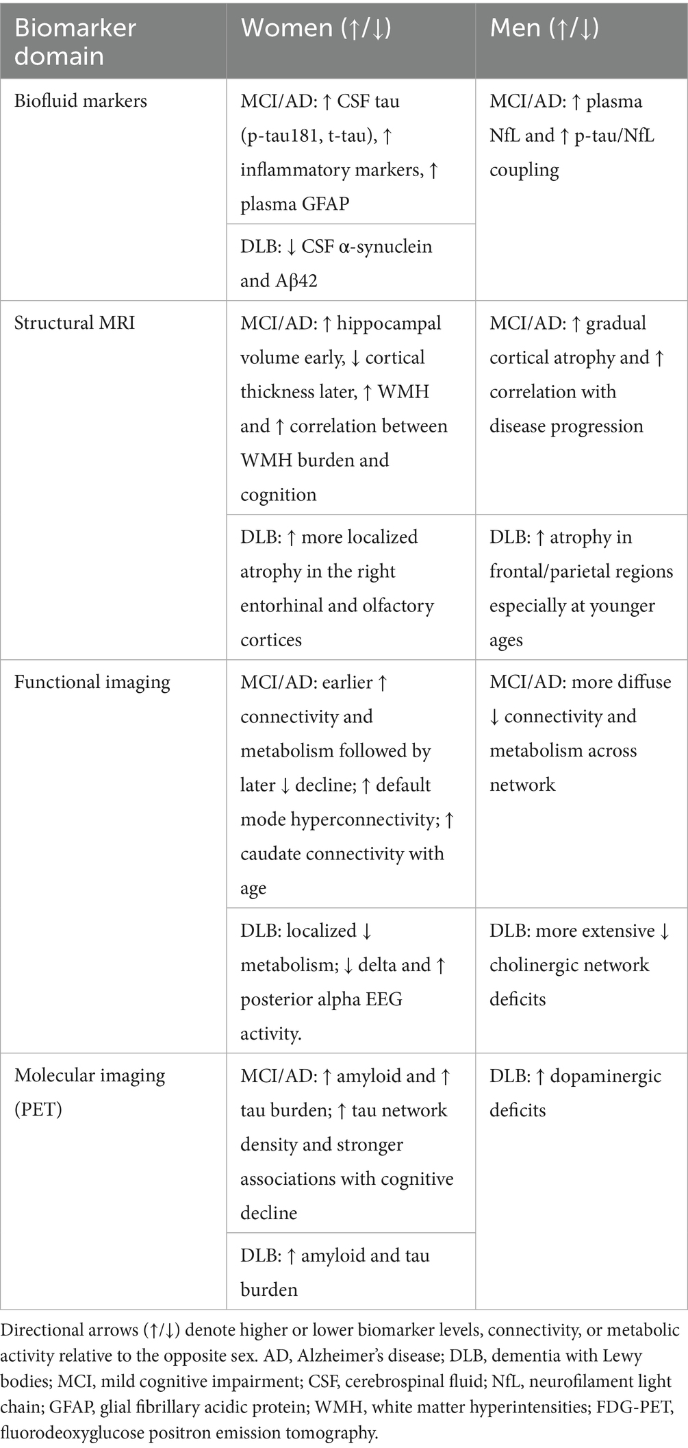 Discussion: There is growing evidence that biological sex significantly influences the pathophysiology of AD and DLB as captured by in vivo biomarkers. These findings highlight the growing importance of analyses that consider sex differences in biomarker research and support the development of personalized diagnostic and therapeutic strategies in neurodegeneration. Future research should prioritize longitudinal studies to define optimal biomarker sequencing and therapeutic windows for each sex, while also investigating the genetic, hormonal, metabolic, pharmacological, and environmental mechanisms that underlie these sex differences, ultimately advancing precision medicine in neurodegenerative disease.