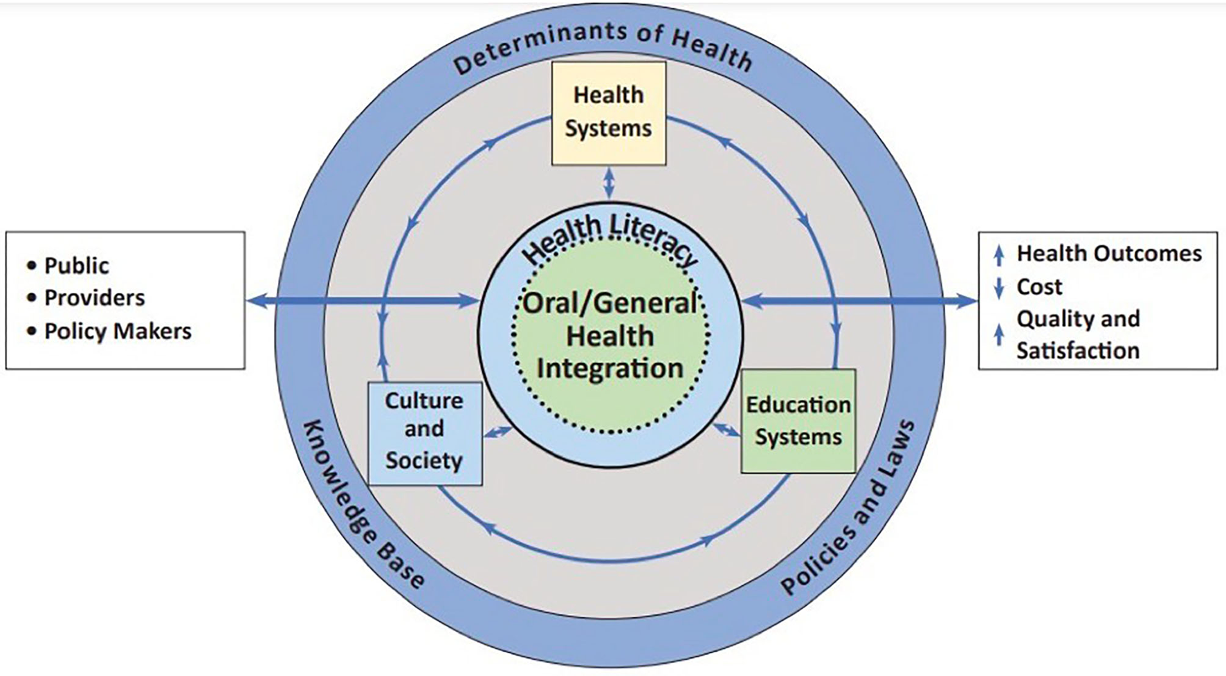 The Framework highlights the role of the public, health care providers, and policy-makers in improving population health and addressing health care inequities. These, and other critical players, such as researchers, educators, and administrators, contribute as individuals in their personal and professional roles and as members of organizations in each of the systems. Intermediate outcomes include improving overall health and well-being, reducing costs, enhancing quality of care, and consumer and provider satisfaction. These outcomes provide feedback into the various systems through the lens of health literacy and oral/general health integration.