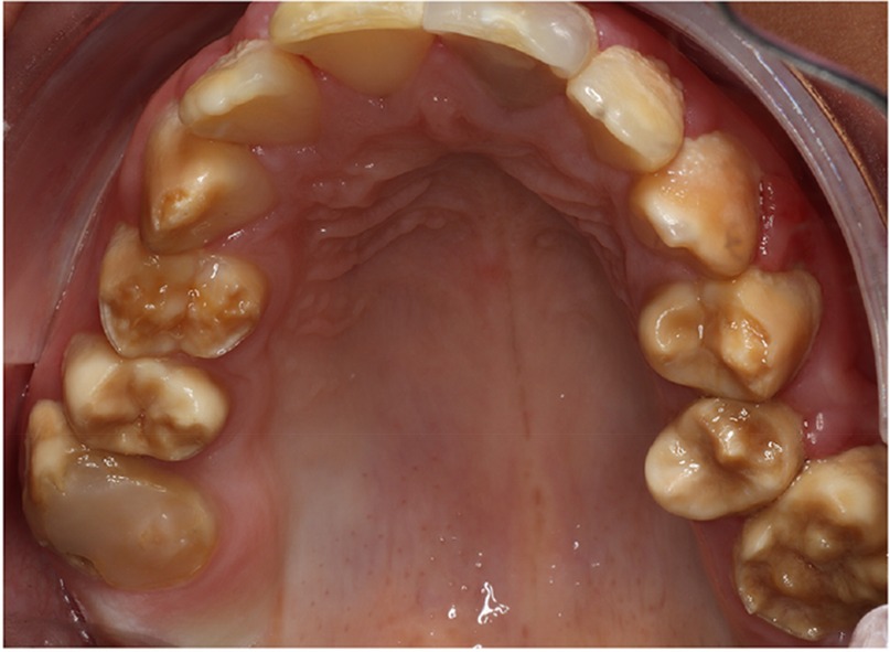 Figure 1. A typical Poly AI patient with maxillary hypomineralised dentition exhibiting mottled yellow and brown discolouration.