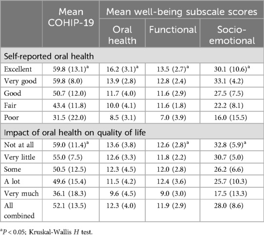Mean COHIP-19 scores showed ascending gradients across the ordinal response categories of the two global items (Table 2), indicating the scale's acceptable concurrent validity in this sample. The pattern with the mean COHIP-19 subscale scores was largely similar, although it was less consistent for the Functional Well-being subscale scores by the impact of oral health on quality of life.