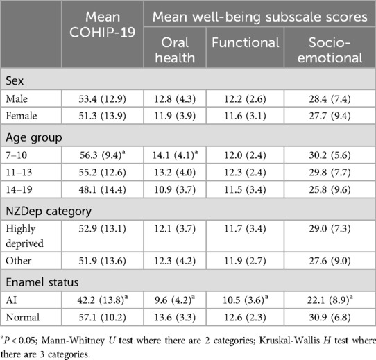 Mean COHIP-19 scores showed consistent gradients by age group, whereby they were highest among the youngest and lowest among the oldest (Table 3); again, the gradient was less consistent with the Functional Well-being subscale scores. There were no differences by sex or deprivation category. There were marked, consistent differences in scale and subscale scores between the AI group and those with normal enamel, whereby the mean COHIP-19 scores were considerably lower among the former.