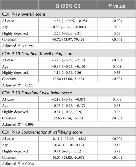 The linear regression analyses (Table 4) showed that, after controlling for age and deprivation, the COHIP-19 score was considerably lower among those with AI. Similar patterns were observed for the subscale scores.