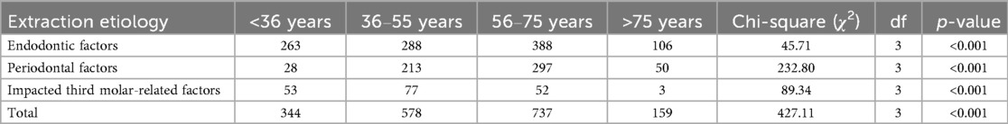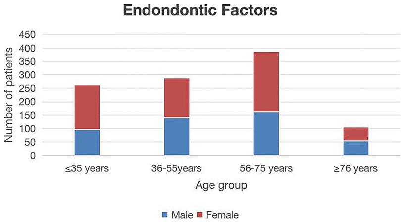 All cases were divided into four groups, including a group <35 years of age (344 cases); 36–55 years of age (578 cases); 56–75 years of age (737 cases), and >76 years of age (159 cases). Statistically significant differences in patient distributions were observed across age groups (P < 0.05). The 56–75 year cohort represented the predominant age group for both endodontic disease and periodontal disease. In contrast, the 36–55 year group exhibited the highest frequency of extractions attributable to impacted third molars. Patients aged >76 years demonstrated the lowest extraction frequency (Table 2). Endodontic factors accounted for 1,045 s molar extractions showing a significantly positive correlation with advancing age (p < 0.05) (Figure 3). Periodontal factors contributed to 588 extractions, showing male predominance (p < 0.05) and significant age-related correlations (p < 0.05) (Figure 4). Impacted third molar factors led to 185 extractions, with no significant age-dependent association (p > 0.05) (Figure 5).