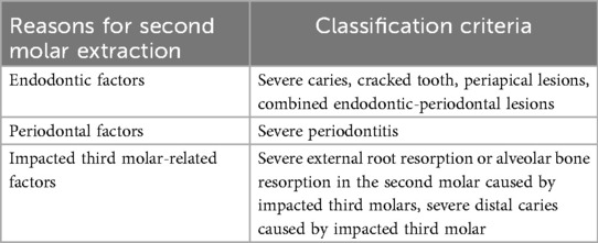 The causes of second molar extraction were categorized into three distinct groups: endodontic factors, periodontal factors, and impacted third molar-related factors (Table 1, Figure 1). Patient demographics and causes were analyzed using SPSS 26.0 (IBM, USA). A significance threshold of P < 0.05 was adopted for statistical inference.