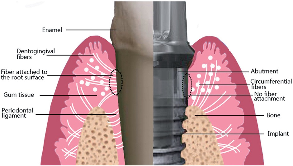 Dental implants, since their advent in the 1960s, have become the primary solution for addressing tooth loss due to their efficiency, durability, and aesthetic benefits. Dental implants usually consist of three parts: an implant, the abutment, and the crown. The abutment is mainly in contact with the surrounding soft tissue. Critical to dental implant success is the peri-implant soft tissue barrier, formed by keratinized epithelium adherent to the abutment. This barrier effectively prevents bacteria and food debris in the mouth from entering the space between the implant and bone tissue, which can reduce the risk of inflammation and infection (1). However, the connective tissue around the implant is collagen fibers oriented parallel to the abutment; there are no fibers inserted into the abutment surface, which is different from the natural tooth, as shown in Figure 1 (2). As such, the soft tissue around the implant has low attachment strength, which facilitates peri-implant infection. Research has shown that the average prevalence of peri-implant inflammation in implant patients is 19.53% (3). Progressive chronic inflammation will eventually cause the implant to loosen and fall out. This fundamental biological limitation underscores the need for strategies to enhance soft tissue integration.