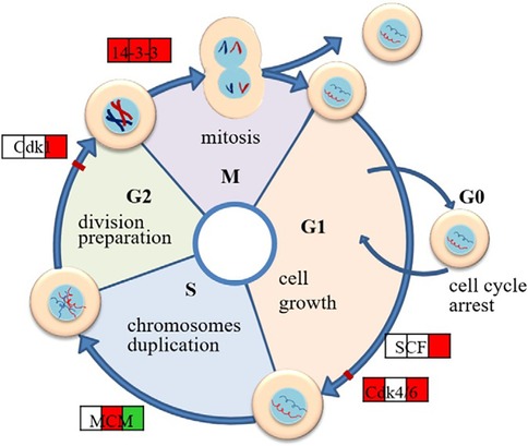 Figure 2. Schematic diagram of regulated cell cycle pathways in L929 exposed to Mg extract.where the three squares stand for the protein expression in 8, 24 and 48 h respectively,and red color shows that at this time point the protein is up-regulated, while green color stands for down-regulation and the blank square means no change of the expression. This figure was adapted from Ref. (40) with permission.