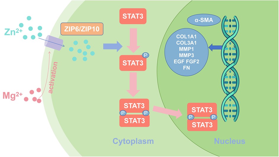 Myofibroblasts play a key role in the advanced stages of wound healing, promoting wound closure and tissue reconstruction. Yang et al. (43) showed that Mg and zinc (Zn) ions can facilitate the differentiation of fibroblasts into myofibroblasts, a process achieved through activation of the STAT3 signaling pathway. Mg2+ upregulates the expression of ZIP6 and ZIP10 and promotes Zn2+ entry into fibroblasts. Increasing intracellular Zn2+ concentration effectively promotes STAT3 phosphorylation, which induces fibroblast differentiation into myofibroblasts and accelerates extracellular matrix deposition, as shown in Figure 3. Recent research showed that connective tissue growth factor mediates the proliferation and migration of mouse fibroblasts through the STAT3 signaling pathway (44). Myofibroblasts not only contract the wound but also synthesize proteins, including collagen and fibronectin, and remodel the extracellular matrix, thereby accelerating peri-implant soft tissue healing.