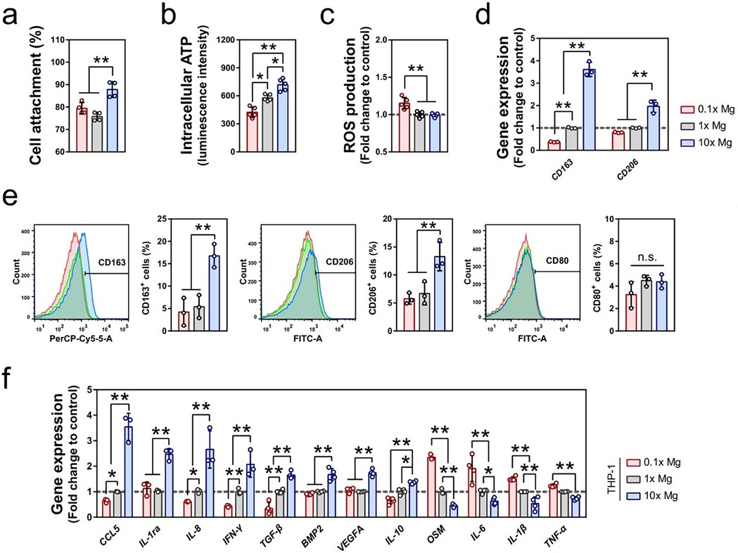 Figure 4. Mg2+ regulated the inflammatory microenvironment through the immunomodulation of macrophages. (a–c) The effects of different concentrations of Mg2+ on the cell attachment (a, n = 4), intracellular ATP level (b, n = 5), and ROS production (c, n = 4) of macrophages differentiated from suspension THP1 monocytes. The data for cell attachment was expressed as a percentage of initially seeded THP-1 cells. (d) The effect of different concentrations of Mg2+ on the gene expression of CD163 and CD206 in THP1-derived macrophages as evaluated by RT-qPCR (n = 3). (e) The effect of different concentrations of Mg2+ on the polarization of macrophages was evaluated by the expression of CD163, CD206, and CD80 using flow cytometry (n = 3). (f) The relative expression of inflammatory-related genes regulated by the stimulation of Mg2+ in THP1-derived macrophages (n = 3). Cited from Qiao W et al. (53) under the terms of the Creative Commons Attribution International License (CC BY4.0).