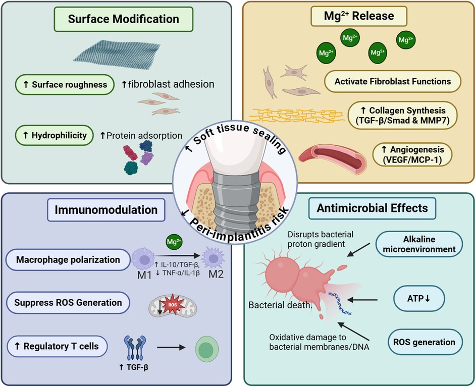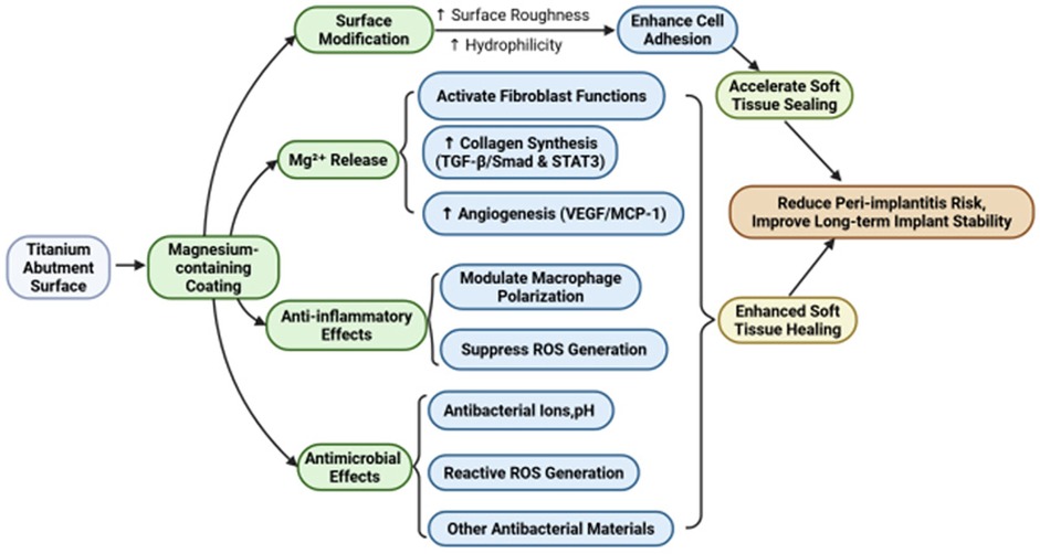 Most titanium abutments are typically designed with a smooth surface. However, having a smooth surface alone is insufficient to establish a robust soft tissue seal (10). Mg-containing coatings offer a bioactive alternative by way of their unique surface properties and the release of therapeutic ions. This review synthesizes mechanistic and clinical evidence on how Mg-containing coatings enhance peri-implant soft tissue healing. We focus on their multifaceted impacts—from cellular interactions to antibacterial effects—and discuss unresolved translational barriers.