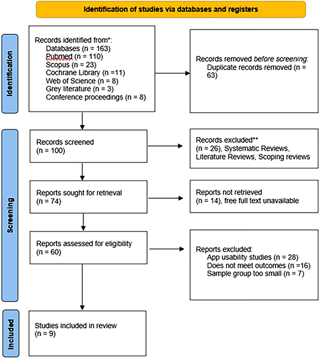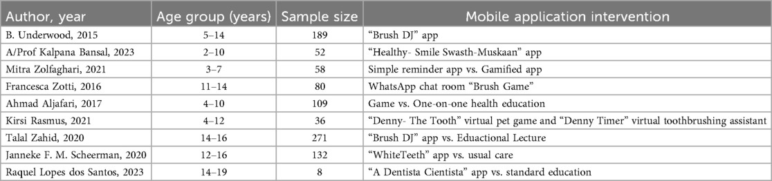 Results: Nine randomized controlled trials involving children aged 2–19 years were included. Mobile applications used ranged from brushing timers and virtual games to educational videos and messaging platforms. Most interventions reported improvements in oral health knowledge, hygiene behaviours, and plaque reduction. Significant clinical improvements were observed in several studies, particularly those incorporating gamification or theory-based behavioural strategies.