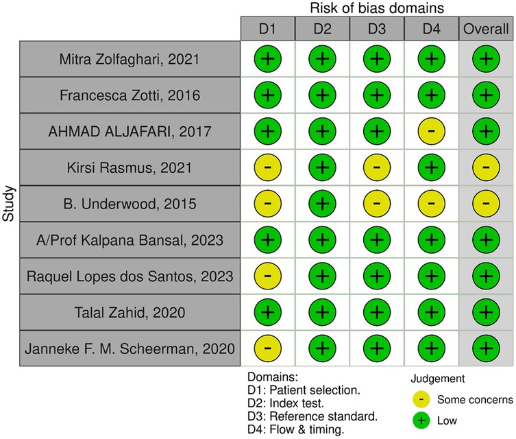QUADAS-2 tool (8) was used to assess the risk of bias of each article and the results were tabulated. The Robvis tool (9) was used to generate visual plot points with the results, as displayed in Figure 2.