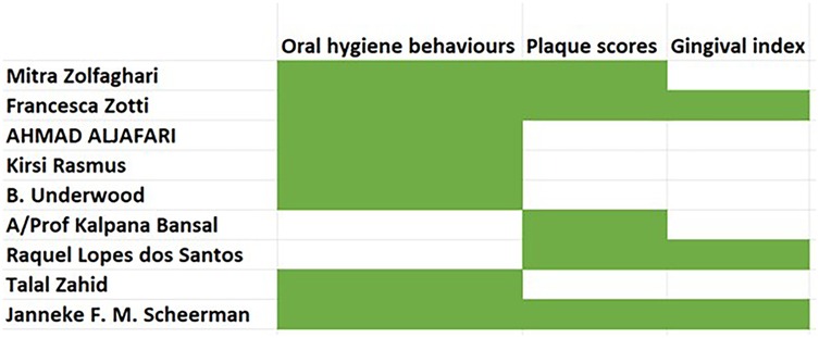 The games were developed for the following applications: toothbrushing skills, reduced plaque accumulation and improved gingival health. Among the included studies, seven studies assessed the skill in oral hygiene behaviours such as toothbrushing (10–12, 14, 16, 18). Five studies assessed the change in plaque scores before and after intervention (10, 11, 13, 14, 17). Lastly, three studies further evaluated the oral health status by assessment of the gingival bleeding index (11, 14, 17). The distribution of outcomes across the studies is depicted in Figure 3.