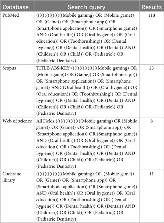 The search strategy combined terms related to oral health, children, game-based teaching, serious games, interactive games and education. Boolean operators (AND, OR) were used to combine the search terms effectively. No filters or date restrictions were placed with only English language publications considered for inclusion.