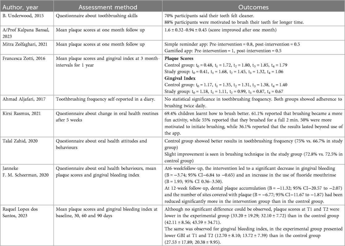Parental involvement also emerged as a crucial factor influencing outcomes. Several studies indirectly highlighted the role of parents in reinforcing behavioural messages delivered through mobile apps. Given the established association between maternal self-efficacy and children's oral health, future interventions may benefit from targeting both children and their caregivers simultaneously to maximize impact. Interventions that explicitly incorporate parental monitoring, feedback loops, or joint child–parent challenges are likely to improve adherence and oral health outcomes, as supported by evidence linking caregiver engagement with sustained behaviour change in pediatric dentistry (27).