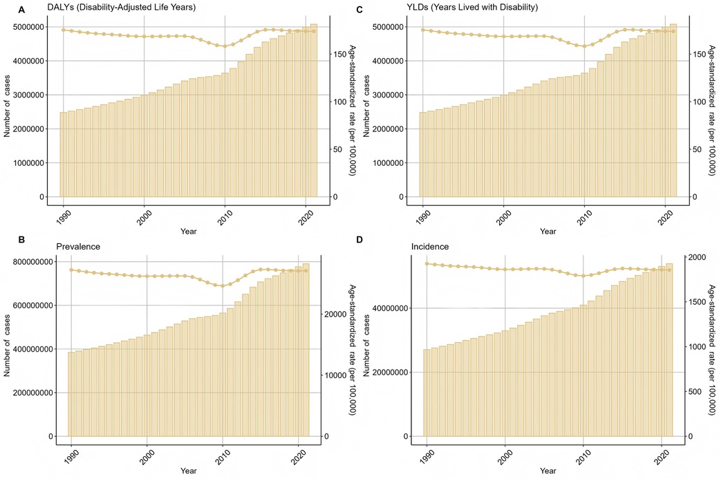 Figure 14. Global periodontal health status (A) DALYs (B) YLDs (C) prevalence (D) incidence, 1990–2021.