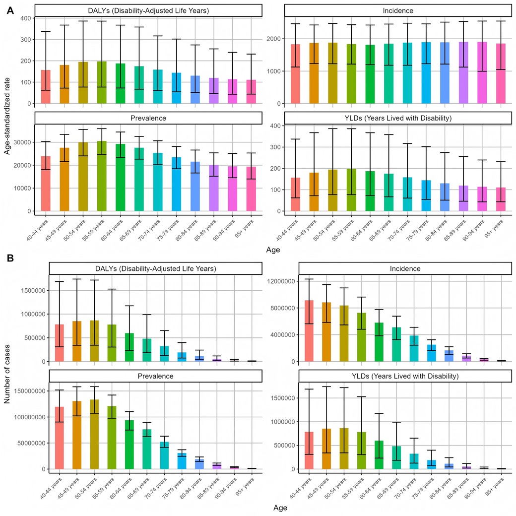 Figure 2. Global distribution of periodontal disease burden in different age groups in 2021 (A) Age-standardized rate (B) number of cases.