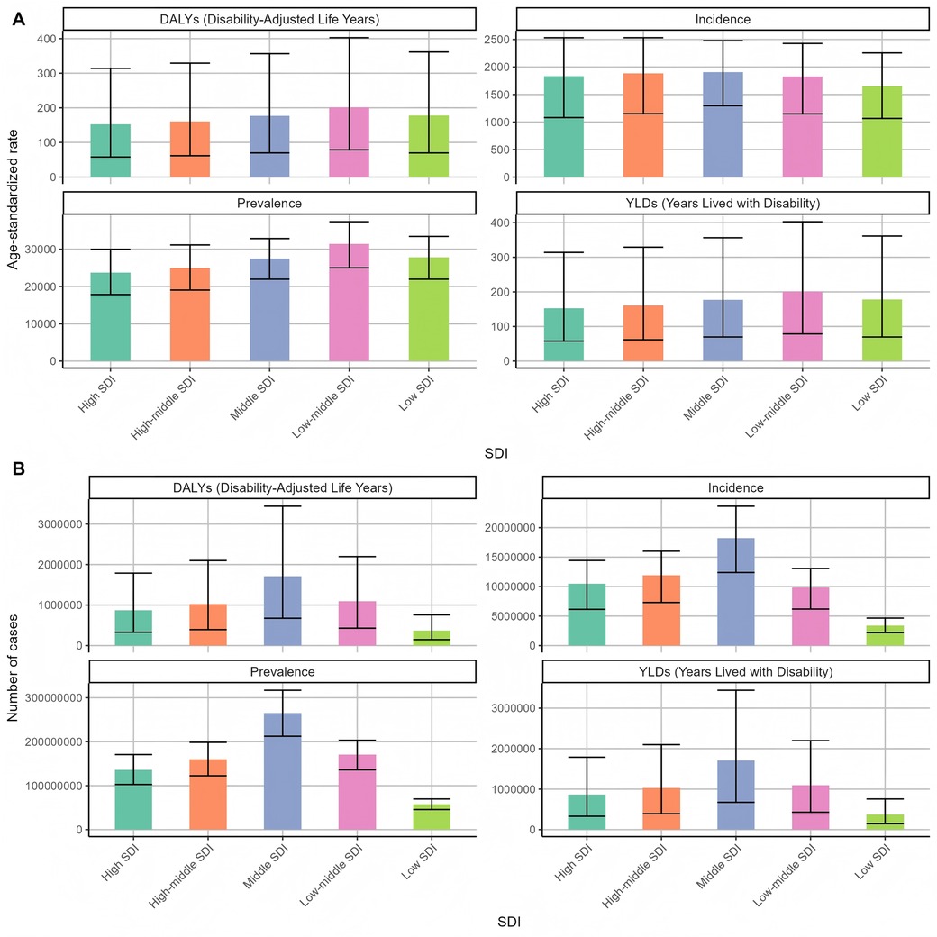 Figure 3. Distribution of periodontal disease burden of different SDIs in the world in 2021 (A) Age-standardized rate (B) number of cases.