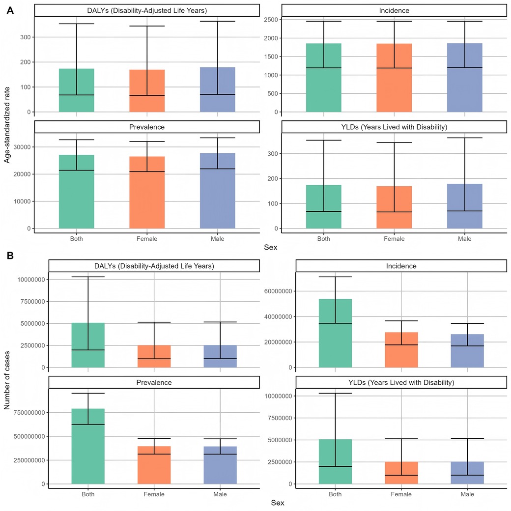 Figure 4. Global gender-specific periodontal disease burden distribution in 2021 (A) Age-standardized rate (B) number of cases.