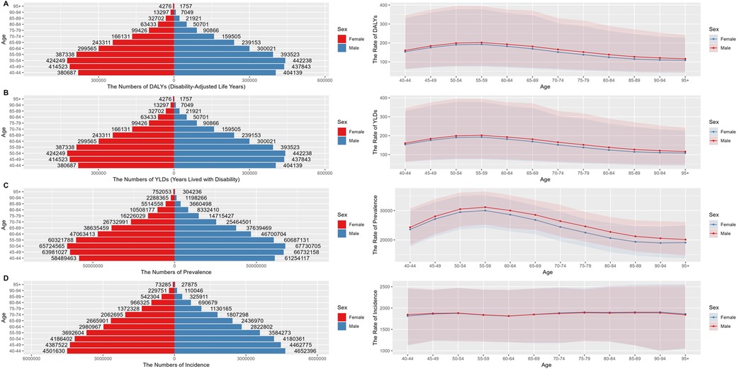 Figure 5. Distribution of periodontal disease burden in men and women of different ages in the world in 2021 (A) DALYs (B) YLDs (C) prevalence (D) incidence.
