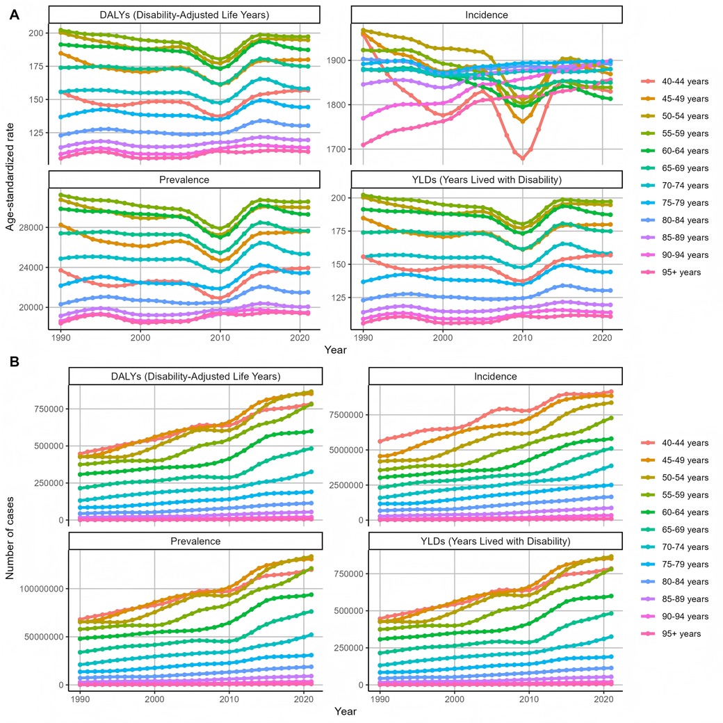 Figure 6. Trends in the distribution of periodontal disease burden in different age groups in the world from 1990 to 2021 (A) Age-standardized rate (B) number of cases.
