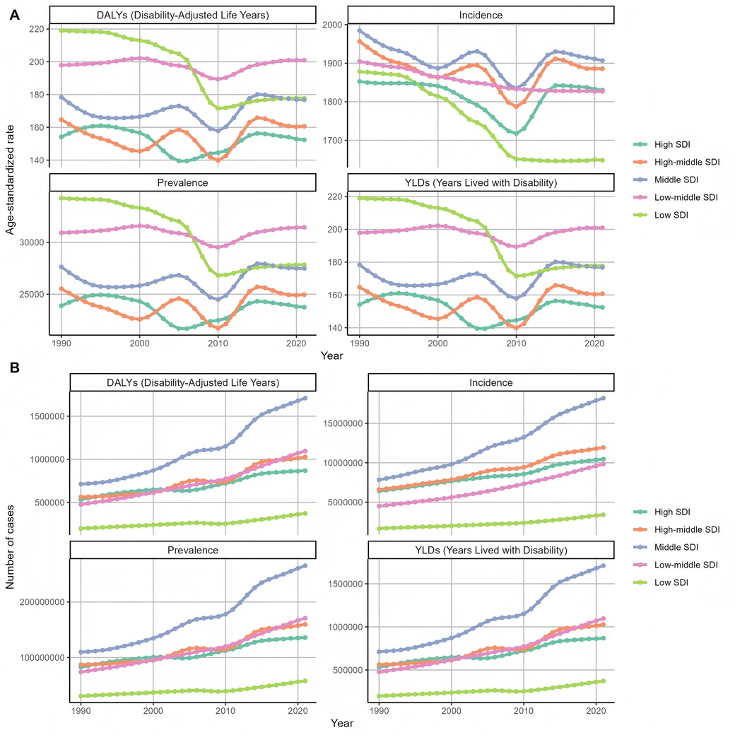 Figure 7. Trends in the distribution of periodontal disease burden of different SDIs in the world from 1990 to 2021 (A) Age-standardized rate (B) number of cases.