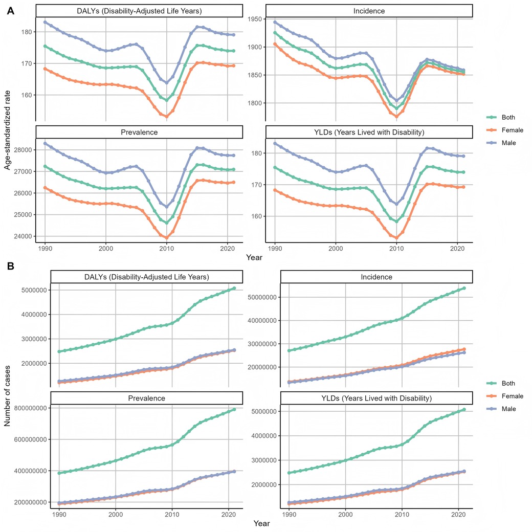 Figure 8. Trends in the distribution of periodontal disease burden in different genders in the world from 1990 to 2021 (A) Age-standardized rate (B) number of cases.