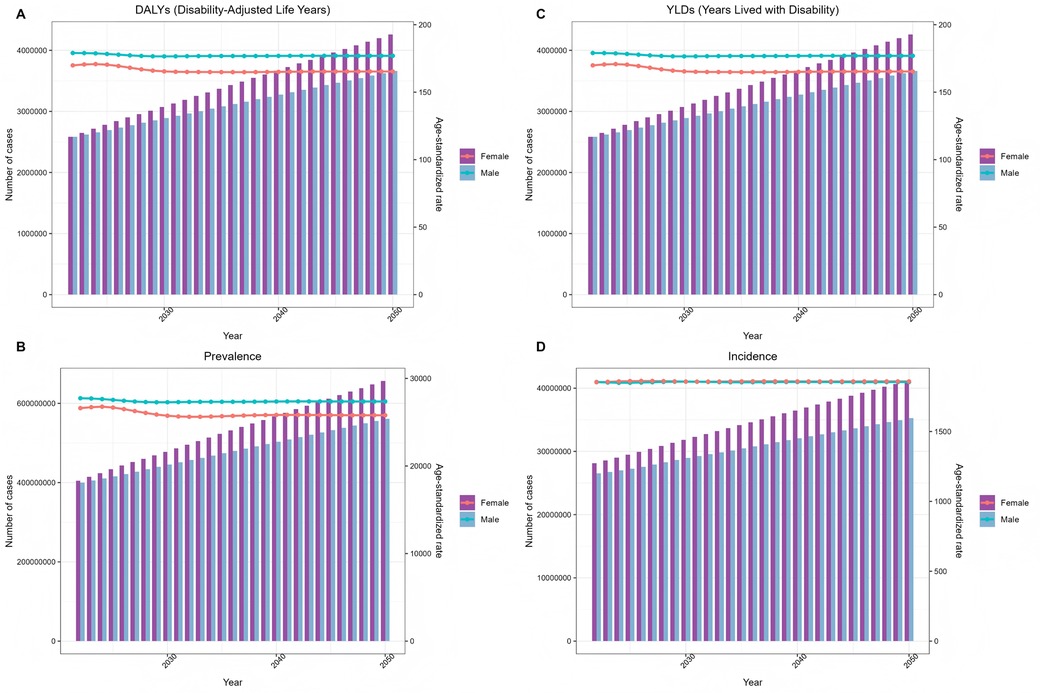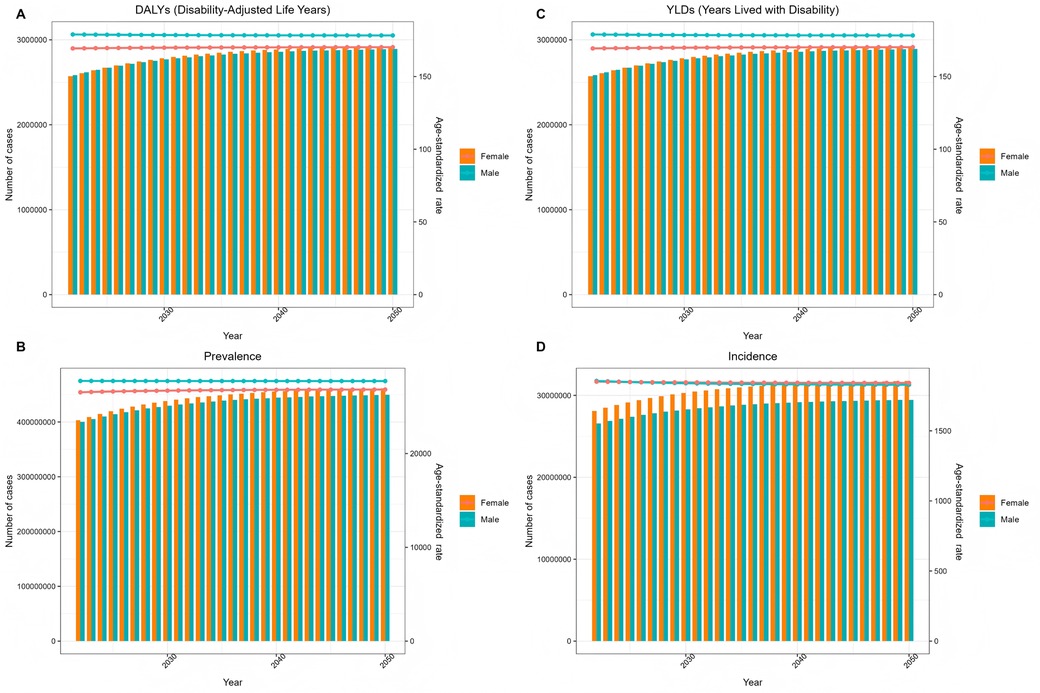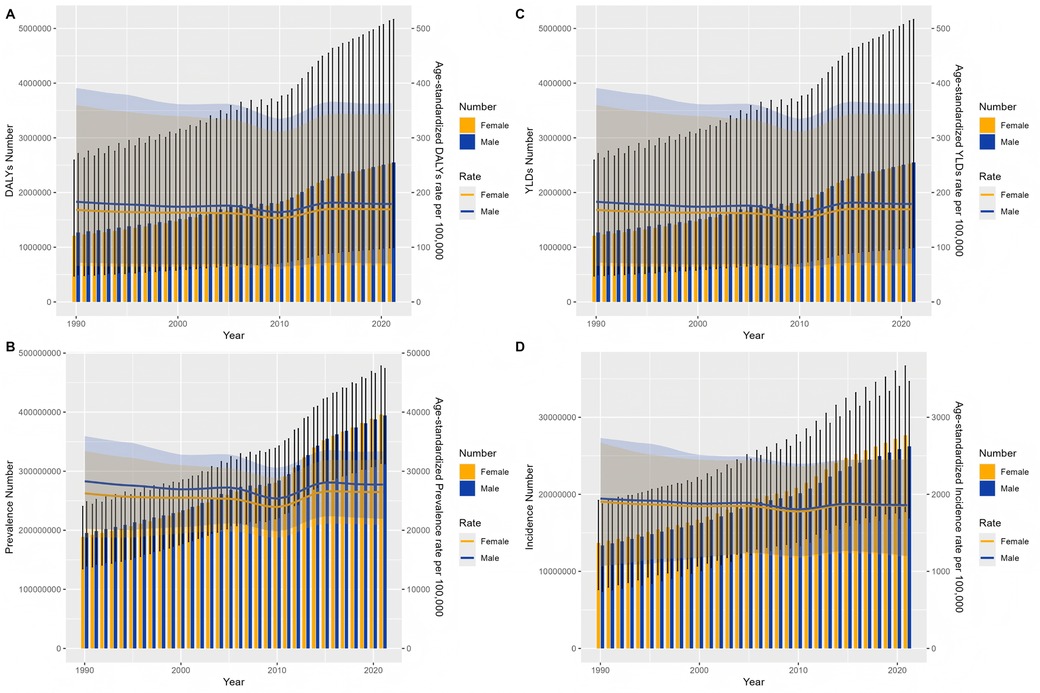 Figure 9. Global trends in the distribution of periodontal disease burden in men and women from 1990 to 2021 (A) DALYs (B) YLDs (C) prevalence (D) incidence.