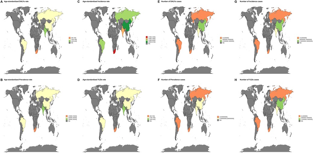 Figure 10. Global burden of periodontal disease. (A–D) Standardized rate burden due to periodontal disease in 2021 (DALYs, YLDs, prevalence, incidence) (E–H) The number of cases due to periodontal disease in 2021 (DALYs, YLDs, prevalence, incidence).