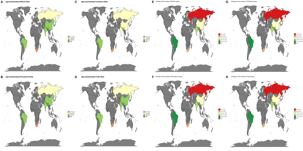 Figure 11. Trends in the global burden of disease due to periodontal disease from 1990 to 2021 (A–D) changes in the EAPC burden due to periodontal disease from 1990 to 2021 (DALYs, YLDs, prevalence, incidence) (E–H) percentage change in the number of cases due to periodontal disease in 2021 (DALYs, YLDs, prevalence, incidence).