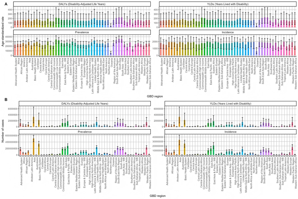 Figure 12. Disease burden caused by periodontal disease in the world. (A) Age-standardized rate (B) Number of cases.