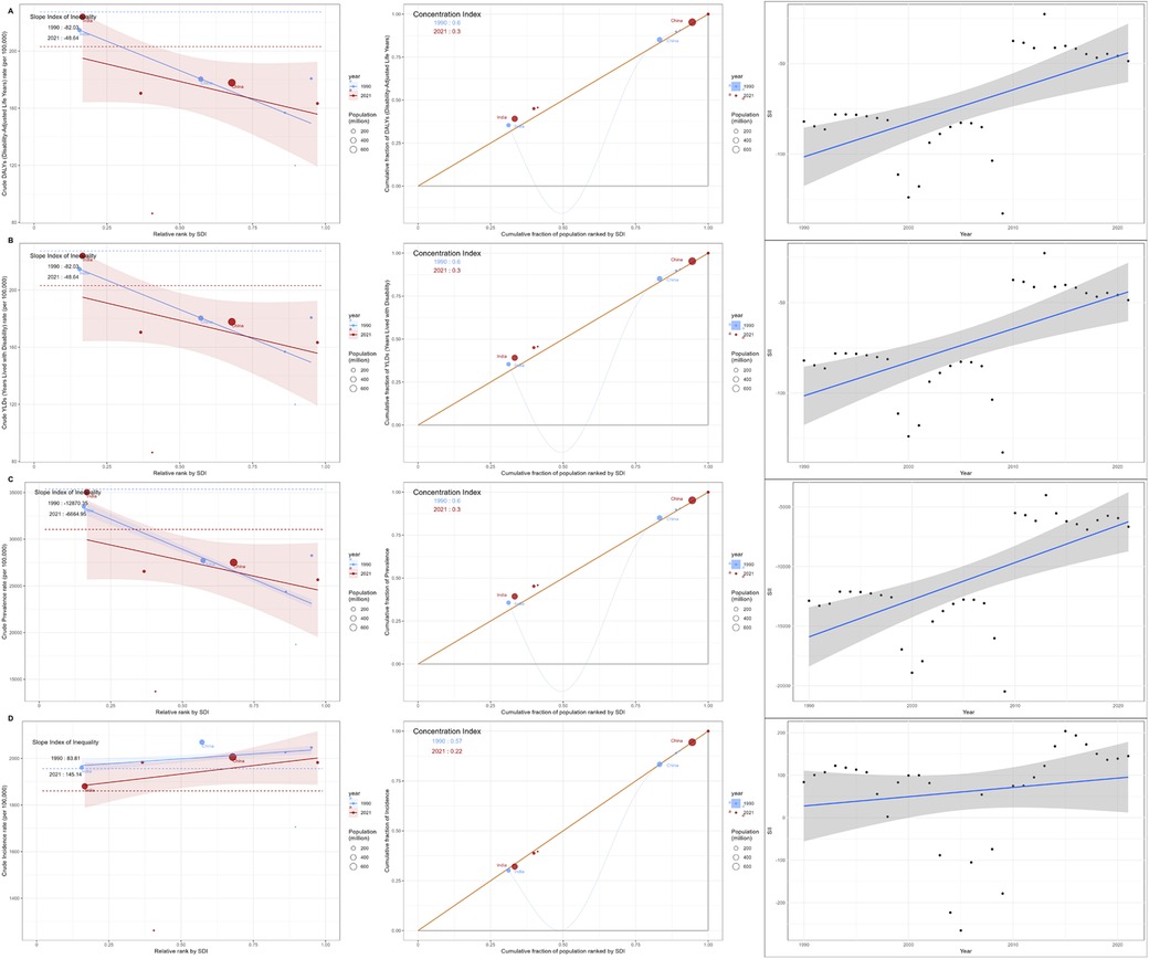 In 1990–2021, the global ASYR, ASPR and ASDR slope index decreased with the increase of SDI, and the ASIR slope index increased with the increase of SDI, while the concentration index decreased significantly in the same period. In the analysis of absolute health inequality, the ASDR slope index increased from−82.03 in 1990 to−48.64 in 2021, that is, the difference in health outcomes among people with different socioeconomic status is decreasing. The slope index of ASPR and ASYR showed a downward trend, while ASIR showed an upward trend. In the relative health inequality analysis, the ASIR, ASYR, ASPR and ASDR concentration index decreased significantly from 1990 to 2021, which also verified the previous results that health inequality was no longer so serious (Figure 14).