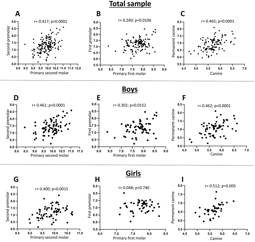 Figure 2. Correlation between the mesiodistal width of primary teeth and their successor permanent teeth. (A,D,G) Correlation between primary second molar and permanent second premolar for the total sample (A), males (D), and females (G). (B,E,H) Correlation between primary first molar and permanent first premolar for the total sample (B), males (E), and females (H). (C,F,I) Correlation between primary canine and permanent canine for the total sample (C), males (F), and females (I).