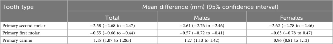 Conclusions: A link between primary and permanent tooth width of canines and posterior dentition was observed, but a difference between sexes exists. Therefore, primary teeth may offer early insight into future space requirements, however their predictive strength is influenced by tooth type and sex.