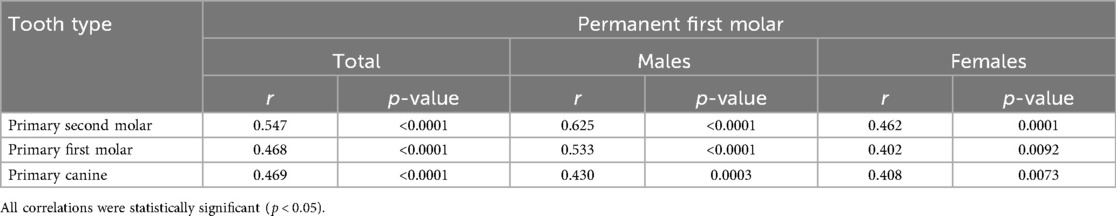 The analysis between primary canine and molars with permanent first molar revealed that the dimensions of all three evaluated primary teeth (canines, first and second molars) were moderately correlated with first permanent molar, with Pearson r ranging from 0.402 to 0.625 (Table 3).
