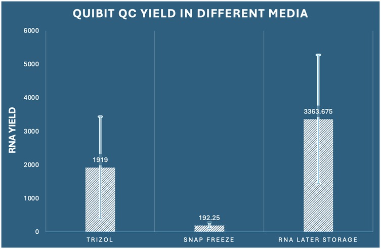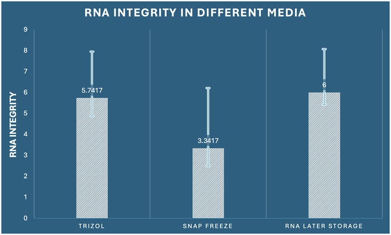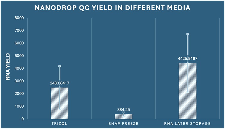 While cryogenic preservation via liquid nitrogen (−180 °C) is the standard protocol for efficiently deactivating both the degradative and transcriptional processes, its implementation in clinical settings often demonstrates significant logistical challenges, along with the need for specialized equipment, trained personnel, and rigid safety protocols. Subsequently, alternate preservation approaches have been developed to inhibit RNA degradation while simultaneously arresting the ongoing transcriptional processes under simulated clinical settings. RNA expression profiling is a dependable molecular indicator of the physiological cellular status, furnishing comprehensive insights into the cell responses under stress circumstances, especially the compound host-pathogen interaction. Securing high-quality RNA with requisite yield is mandatory for downstream applications, including quantitative polymerase chain reaction analysis and RNA sequencing (RNA-seq) (7–9). Despite the critical importance of RNA integrity assessment, comprehensive quality control protocols remain insufficiently implemented across numerous investigations in the field, potentially compromising the validity and reproducibility of reported findings (10–14).