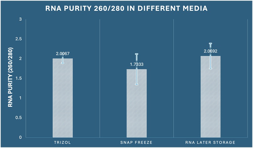 Figure 3. Comparison of RNA purity (260/280 ratio) among the three preservation methods in dental pulp tissue.