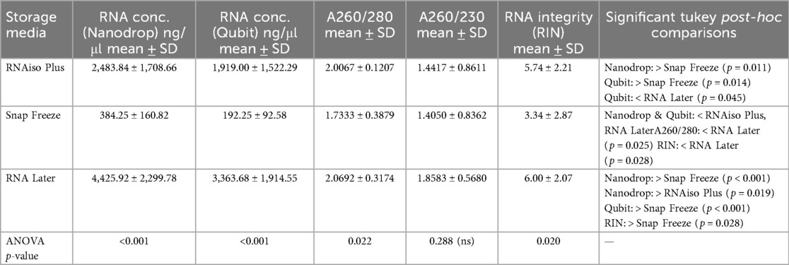 The concordance between Nanodrop and Qubit measurements (Pearson correlation coefficient r = 0.924, p < 0.001) validated the reliability of our quantification approaches. RNA Later storage again exhibited superior performance with the highest mean yield of 3,363.68 ng/μl (SD ± 1,914.55, range: 892.3–6,841.2 ng/μl), representing a 17.5-fold advantage over snap freezing and a 1.8-fold advantage over RNAiso Plus extraction. RNAiso Plus extraction demonstrated intermediate performance with a mean yield of 1,919.00 ng/μl (SD ± 1,522.29, range: 324.1–4,876.8 ng/μl), while snap freezing again showed the poorest performance with a mean yield of 192.25 ng/μl (SD ± 92.58, range: 78.4–341.7 ng/μl). The ratio of Qubit to Nanodrop measurements provided additional insights into RNA purity and potential contamination. RNA Later storage samples showed the most consistent ratio (mean ratio: 0.76 ± 0.12), suggesting minimal interferent contamination. RNAiso Plus samples demonstrated a slightly lower ratio (0.77 ± 0.18), while snap-frozen samples showed the highest variability (0.50 ± 0.24), indicating potential degradation or contamination issues. Comprehensive post-hoc analysis confirmed that all pairwise comparisons remained statistically significant (p < 0.05), with effect sizes consistent with spectrophotometric measurements. RNA Later storage demonstrated superior yield compared to RNAiso Plus extraction (mean difference: 1,444.68 ng/μl, 95% CI: 28.99–2,860.36, p = 0.045, Cohen's d = 0.89) and exhibited dramatic superiority over snap freezing (mean difference: 3,171.43 ng/μl, 95% CI: 1,755.74–4,587.11, p < 0.001, Cohen's d = 2.24). RNAiso Plus extraction also significantly outperformed snap freezing (mean difference: 1,726.75 ng/μl, 95% CI: 311.06–3,142.44, p = 0.014, Cohen's d = 1.64) (Table 1).