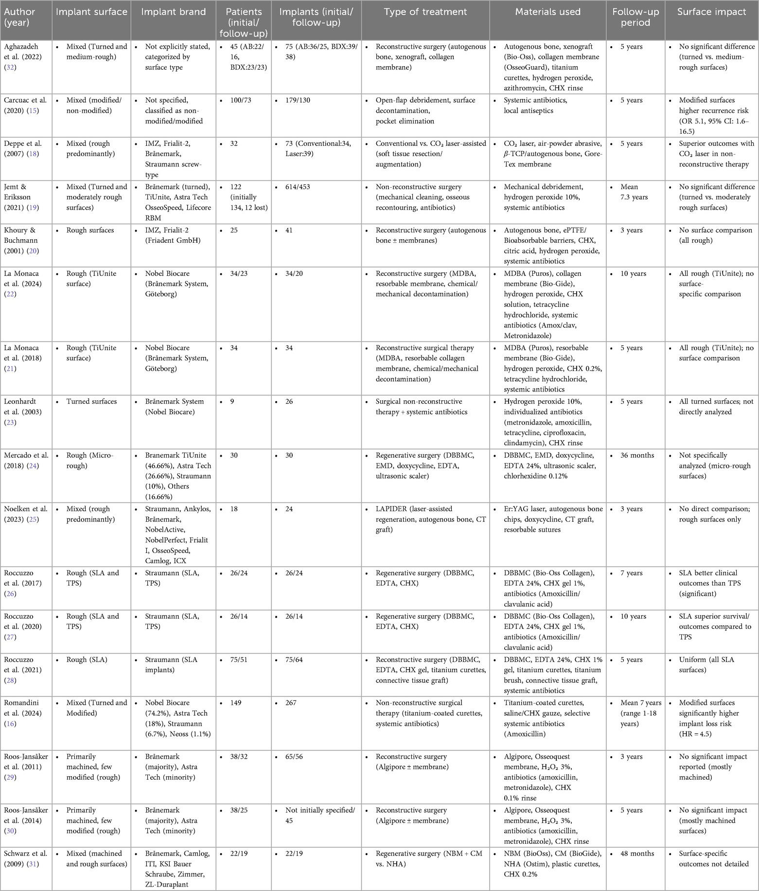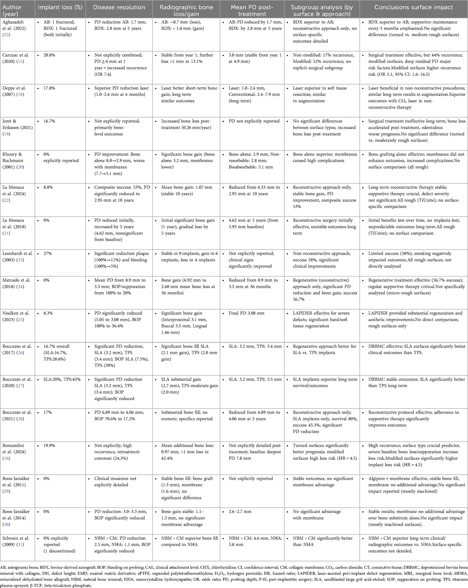 For regenerative approaches, implant surface also played a key role. SLA implants demonstrated favorable long-term bone gain and PD reduction (26–28), whereas TPS implants performed poorly even when grafting was applied (27). Although smooth implants were less frequently studied in regenerative contexts, available evidence suggests they may perform adequately when combined with supportive therapy (29, 30).