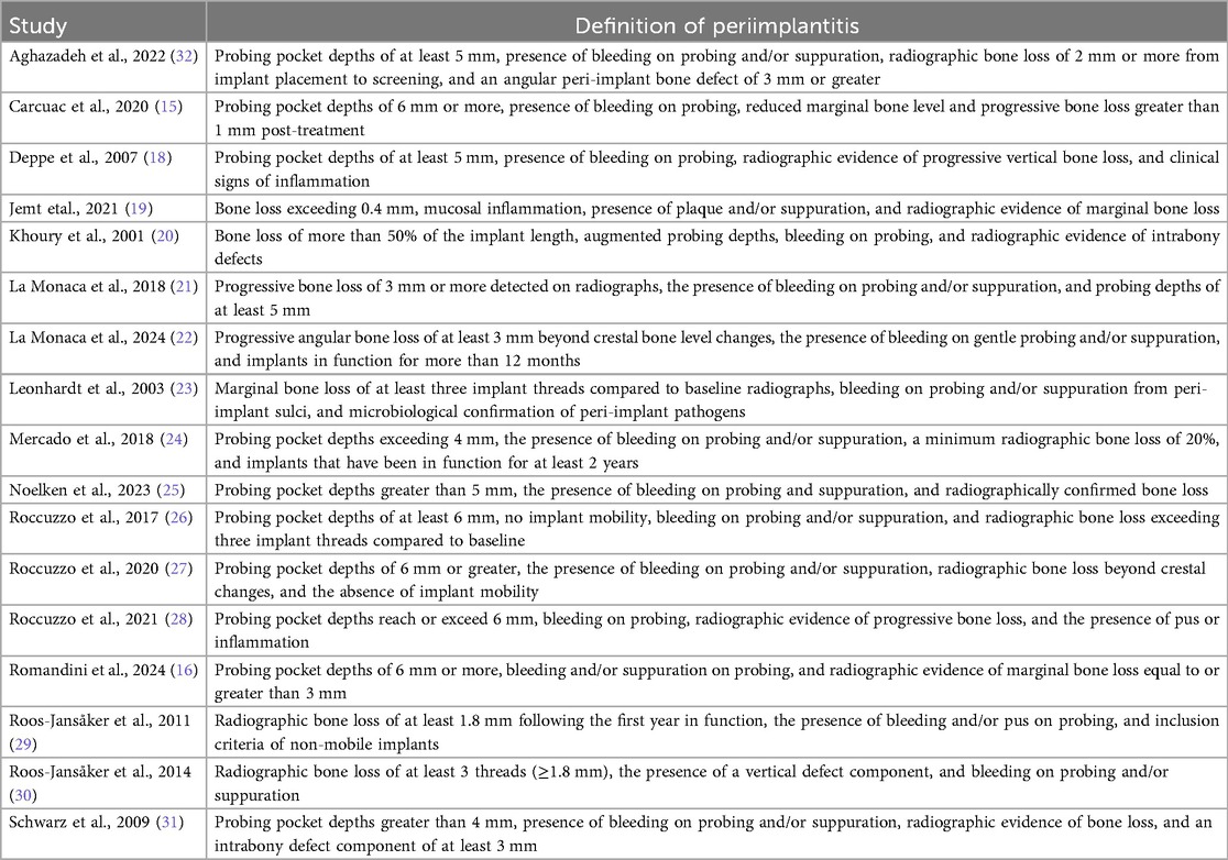 Radiographic evaluation of bone loss is another widely accepted criterion for peri-implantitis diagnosis. The threshold for bone loss varies among studies, with the most commonly reported value being ≥3 mm, as seen in Romandini et al. (16). Other studies, including Carcuac et al. and Aghazadeh et al., defined progressive bone loss based on post-treatment changes or specific defect characteristics, such as angular defects of ≥3 mm (15, 32). A more conservative threshold of ≥1.8 mm was applied in studies such as Roos-Jansåker et al., reflecting the variability in bone loss progression (29, 30).