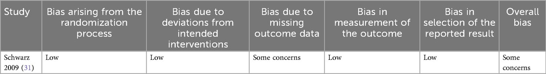 Two investigators independently appraised the risk of bias of the included studies using the Cochrane Risk of Bias Tool 2.0 (RoB2) for RCTs. For non-RCTs the Risk of Bias in Non-randomized Studies of Interventions (ROBINS-I) tool was used. Any inconsistencies were resolved by consensus with a third investigator (CG).