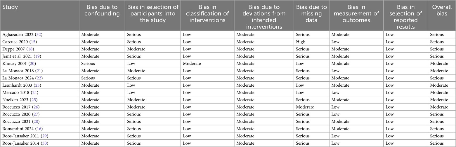 Among the non-randomized studies, serious risk of bias was frequently noted in selection of participants e.g., Aghazadeh, Carcuac, and La Monaca (15, 17, 22) and missing data e.g., Roccuzzo, Romandini, Roos-Jansaker (16, 27, 30). However, intervention classification and reporting of results were generally at low risk across studies. Confounding and deviations from interventions were rated as moderate risk in most cases.