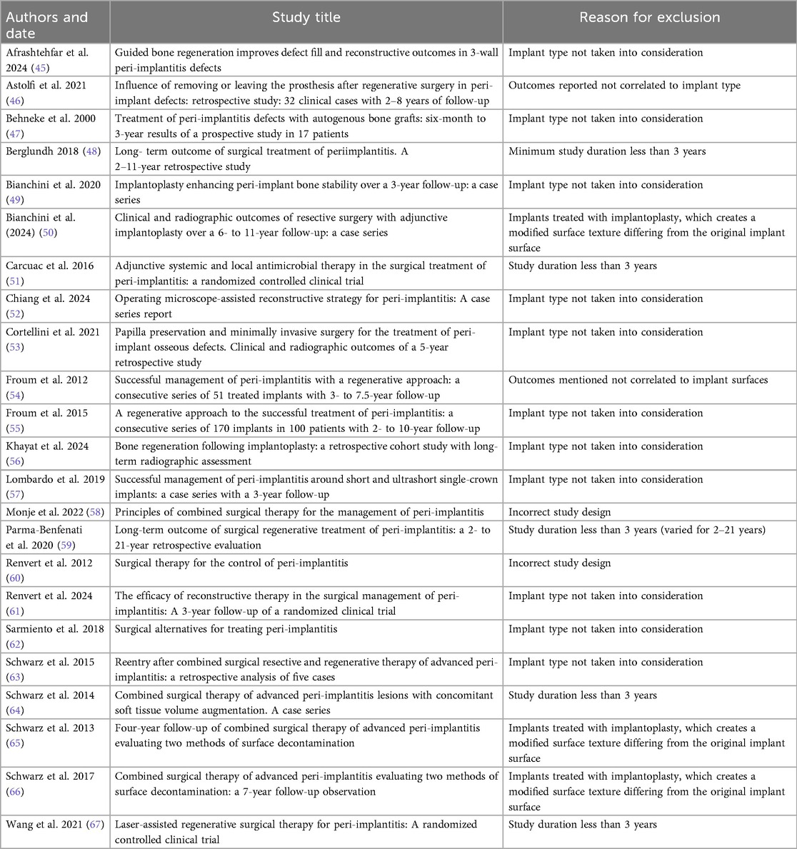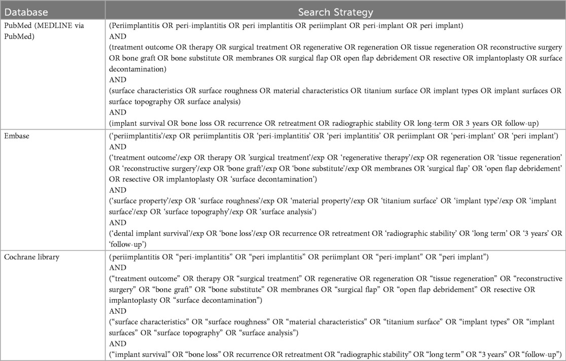 To identify relevant studies, we systematically searched PubMed, Embase, and the Cochrane Library. The search strategy was carried out in English language from database inception for articles published between 2000 and 2025. Two investigators (AZ and PG) independently reviewed the search results and screened the titles and abstracts. Full texts of all potentially eligible studies were obtained. In PubMed, the following search strategy was used: “(Periimplantitis OR peri-implantitis OR peri implantitis OR periimplant OR peri-implant OR peri implant) AND (treatment outcome OR therapy OR surgical treatment OR regenerative OR regeneration OR tissue regeneration OR reconstructive surgery OR bone graft OR bone substitute OR membranes OR surgical flap OR open flap debridement OR resective OR implantoplasty OR surface decontamination) AND (surface characteristics OR surface roughness OR material characteristics OR titanium surface OR implant types OR implant surfaces OR surface topography OR surface analysis) AND (implant survival OR bone loss OR recurrence OR retreatment OR radiographic stability OR long-term OR 3 years OR follow-up).” This search strategy was adapted to suit the other electronic sources. The reference lists of retrieved articles were also checked to identify additional studies of interest. Any inconsistencies were resolved by consensus with a third investigator (CG). The complete search strategies for all databases are provided in Appendix 2.