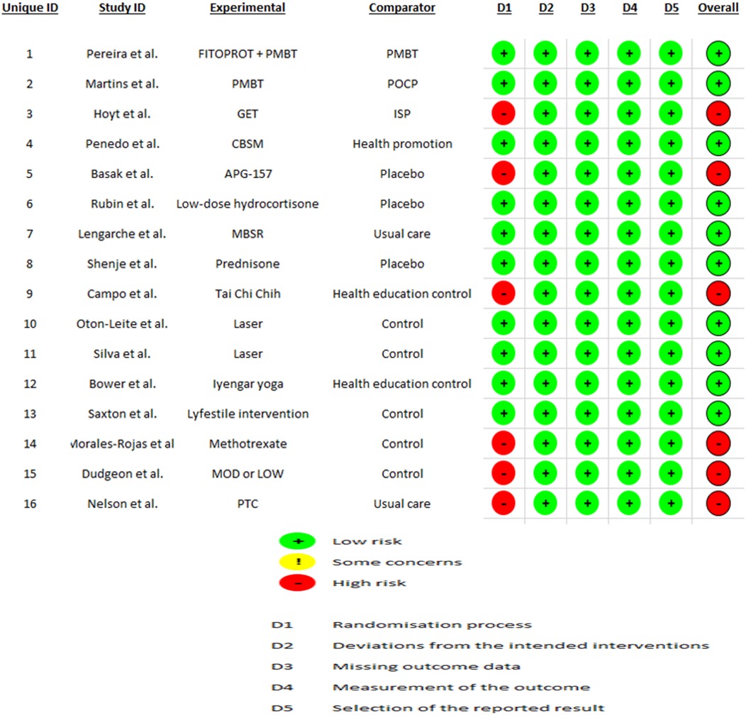 Using the Cochrane Risk of Bias 2.0 tool, two calibrated reviewers (RA and JM) separately assessed the risk of bias (RoB) of the included studies (18), and a high level of inter-reviewer agreement was observed (k = 0.98). Randomisation procedure, deviations from planned interventions, lack of outcome data, outcome assessment, and selection of reported outcomes are the five categories in which this instrument evaluates randomised clinical trials. Studies are classified as low risk of bias, moderate concerns or high risk of bias according to these factors.