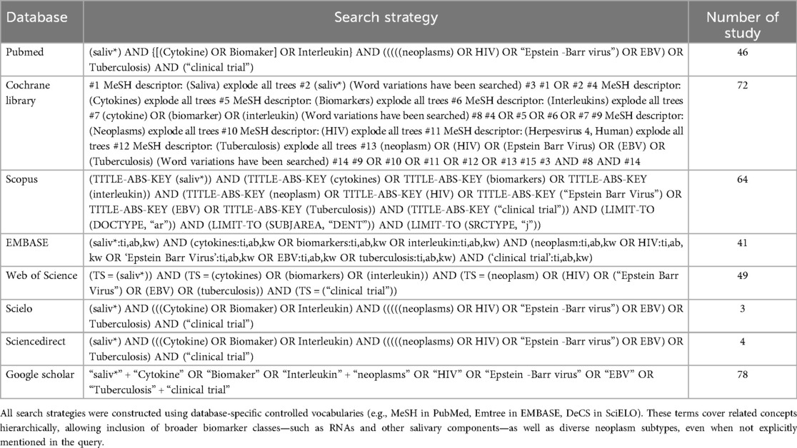 For the present systematic review, a bibliographic search was carried out in 8 electronic databases (Pubmed, Cochrane Library, Scopus, EMBASE, Web of Science (WoS), Scielo, Sciencedirect and Google Scholar) until July 2025; combining keywords and subject titles according to the thesaurus of each database: “saliv*”, “cytokine”, “biomaker”, “interleukin”, “neoplasms”, “HIV”, “Epstein -Barr virus”, “EBV”, “tuberculosis” and “clinical trial”. The search strategies of each of the databases are found in Table 1.