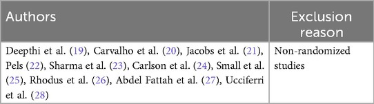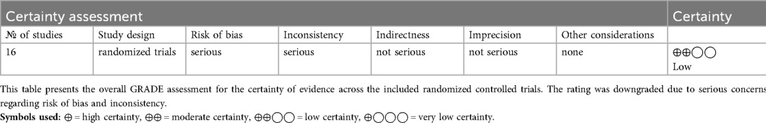 First, although the studies included were RCTs, six of them presented a high risk of bias (31, 33, 37, 42–44), particularly in aspects related to blinding, deviations from intended interventions, or incomplete outcome data. This contributes to uncertainty in the overall quality of evidence, as confirmed by the GRADE assessment, which rated the certainty as low due to concerns about risk of bias and inconsistency.