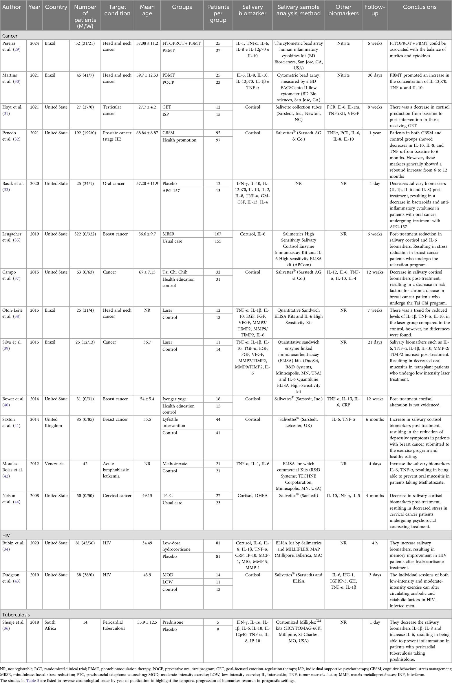 The number of patients in all studies ranged from 14 to 322. Systematic diseases or conditions in all studies were: cancer (29–33, 35, 37–42, 44), HIV (34, 43) and tuberculosis (46); having as treatments drugs (33, 34, 36, 42), relaxation exercises and stress reduction (31, 32, 35, 37, 40, 41, 43, 44) and laser (29, 30, 38, 39). The mean age was reported in 14 studies (29, 31–37, 39–41, 43, 44) which ranged between 34.49 and 67 years. Follow-up time in all studies ranged from 4 h to 6 months. The most used salivary biomarkers were cortisol and interleukins (Table 3).