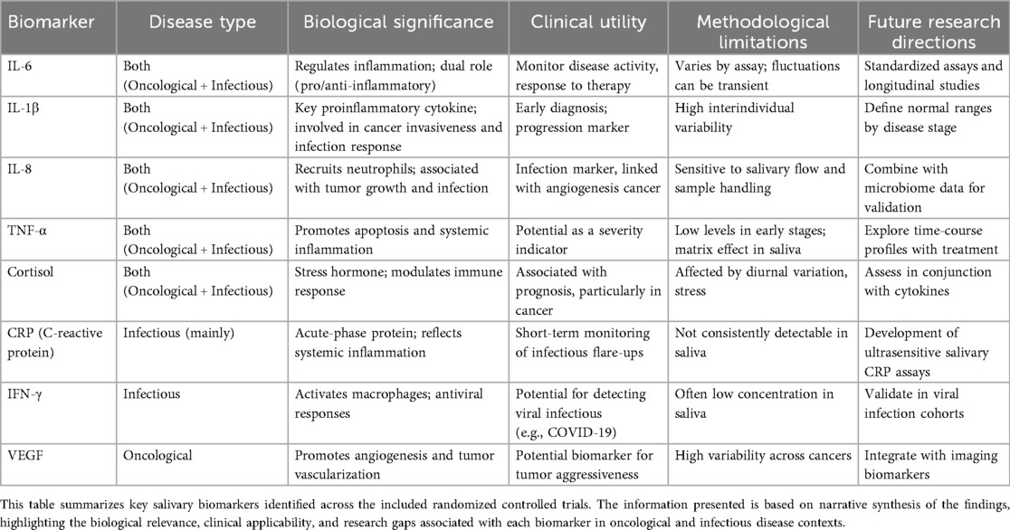 This systematic review included 16 randomized controlled trials evaluating the prognostic utility of salivary biomarkers in oncological and infectious diseases. The most commonly reported biomarkers were interleukins (especially IL-1β, IL-6, IL-8, and IL-10) and cortisol, which were frequently elevated in patients with systemic inflammatory conditions and reduced following therapeutic interventions. These findings highlight the growing potential of saliva as a non-invasive medium for monitoring disease progression and treatment response in diverse clinical scenarios (45, 46).
