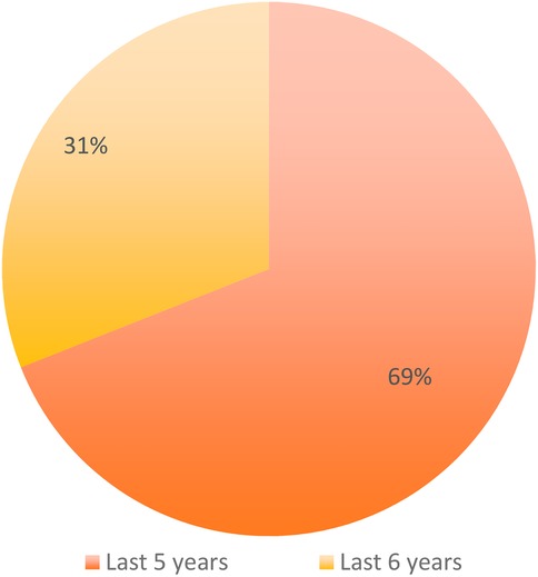 Figure 1. Distribution of respondents according to the time since obtaining orthodontic specialization (last 5 years vs more than 5 years).